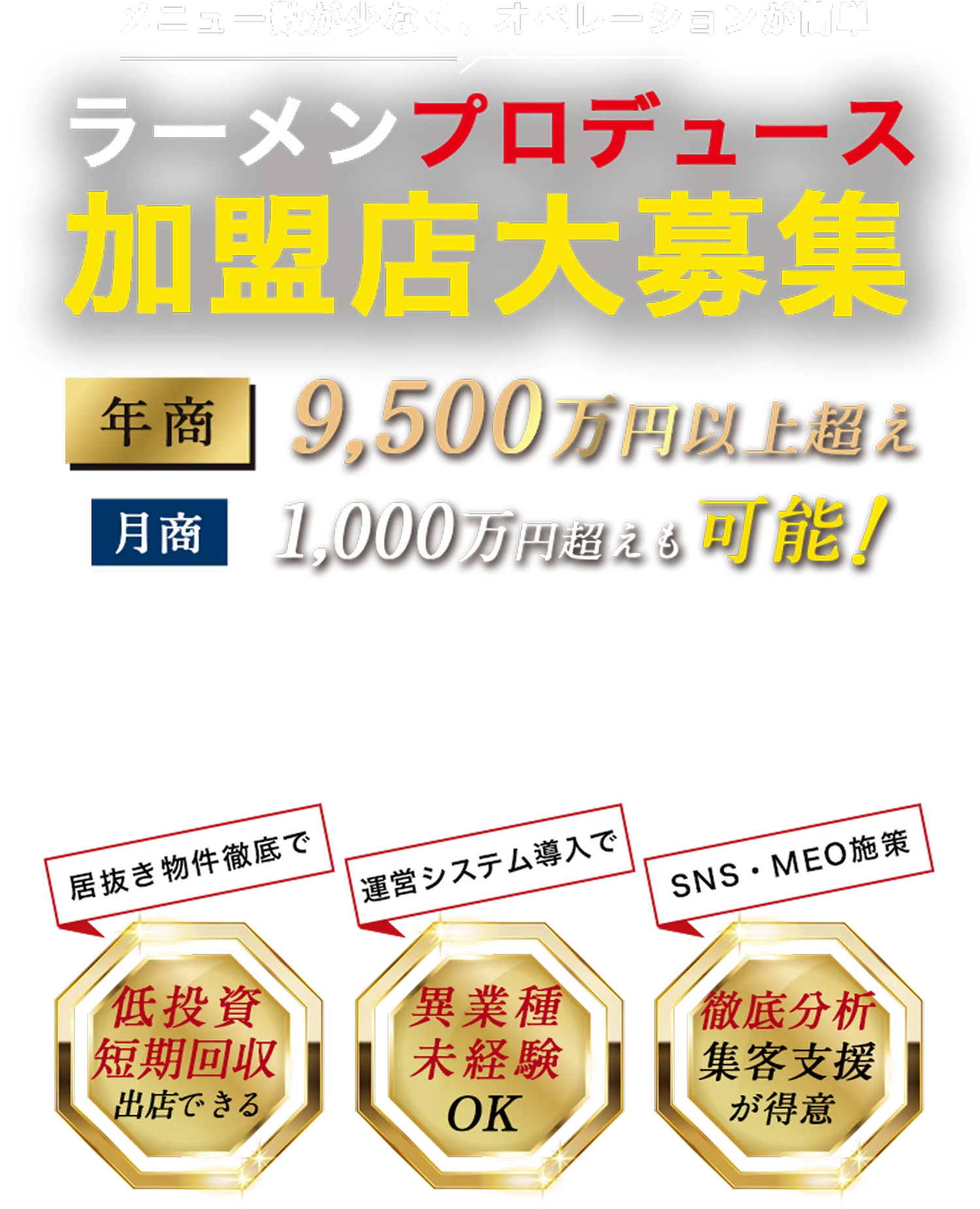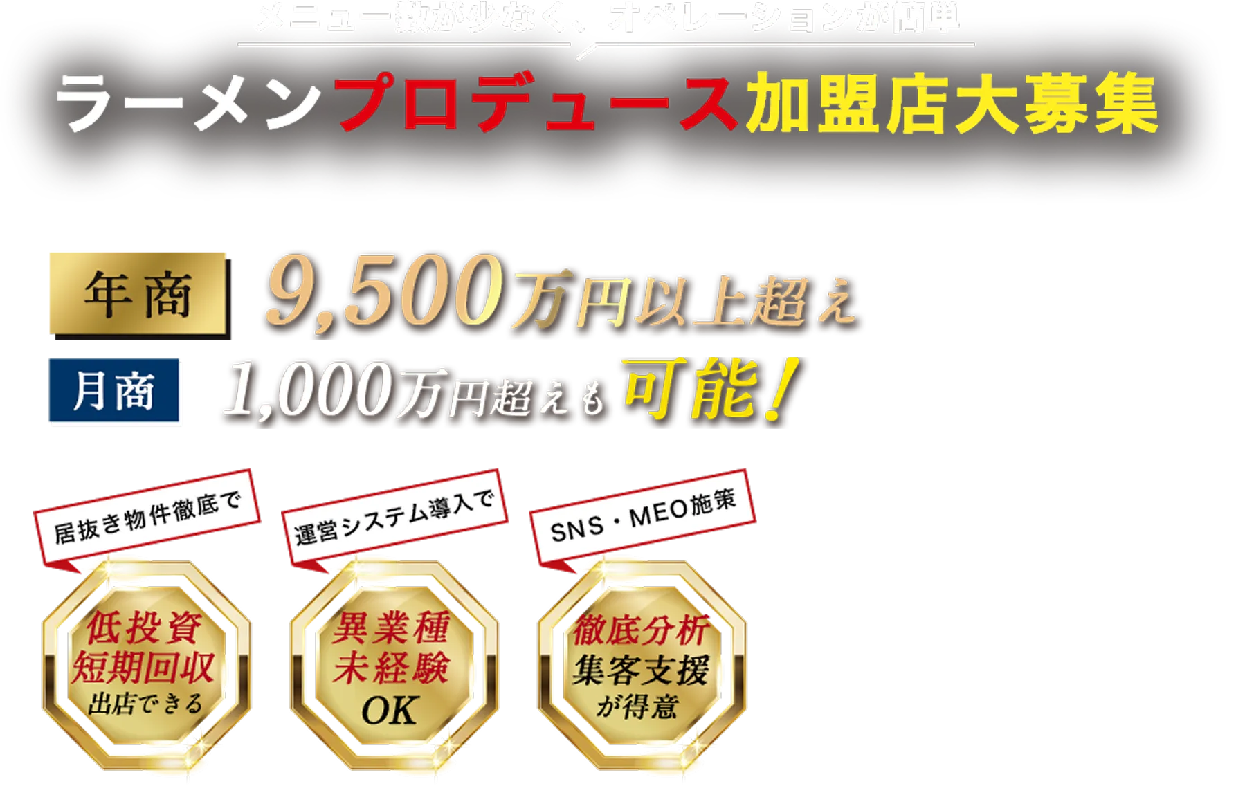 運営可能本部直営店の中華そば二兎はアルバイトだけで運営開始。開業前に本部直営店で研修を受けずに出店可能。最も少ない作業工程を実現するオペレーション指導。